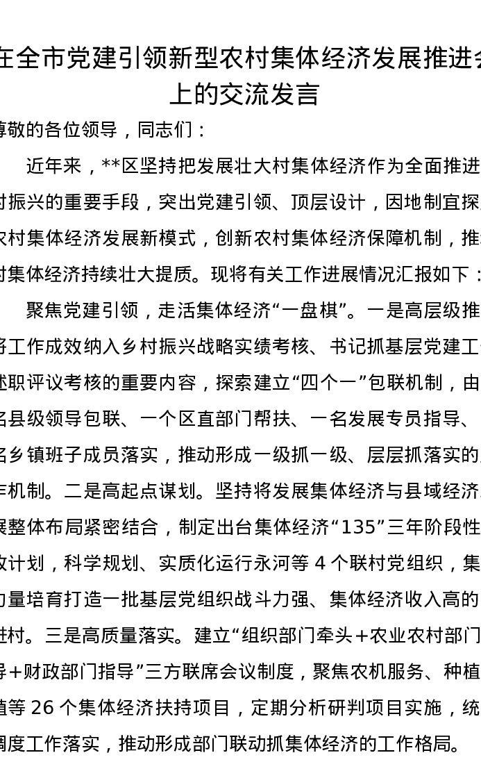 在全市党建引领新型农村集体经济发展推进会上的交流发言