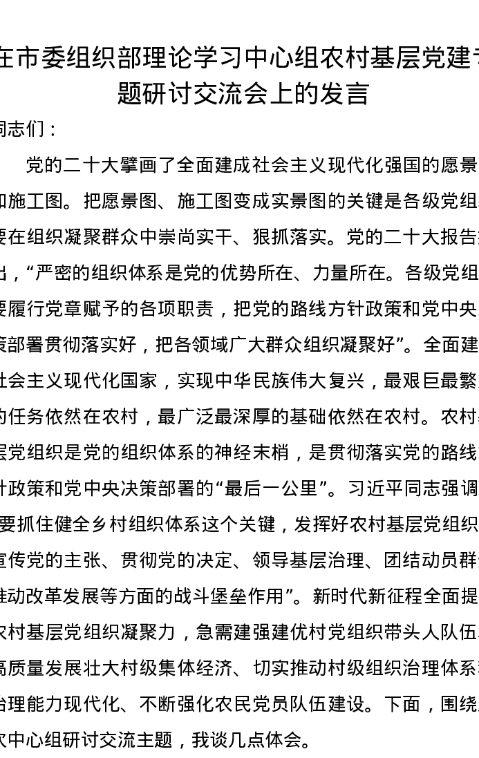 在市委组织部理论学习中心组农村基层党建专题研讨交流会上的发言