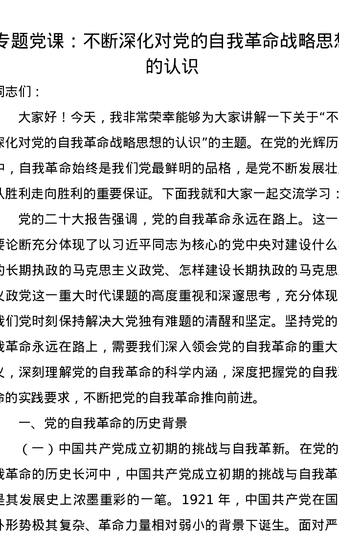 党课讲稿:不断深化对党的自我革命战略思想的认识