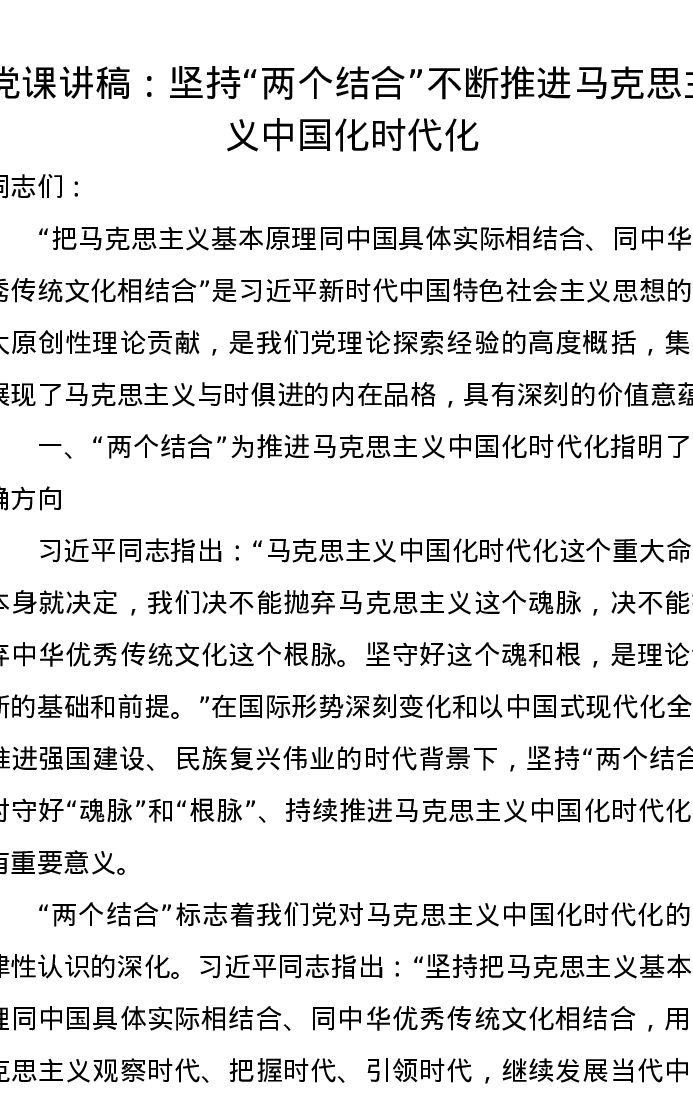 党课讲稿:坚持“两个结合”不断推进马克思主义中国化时代化