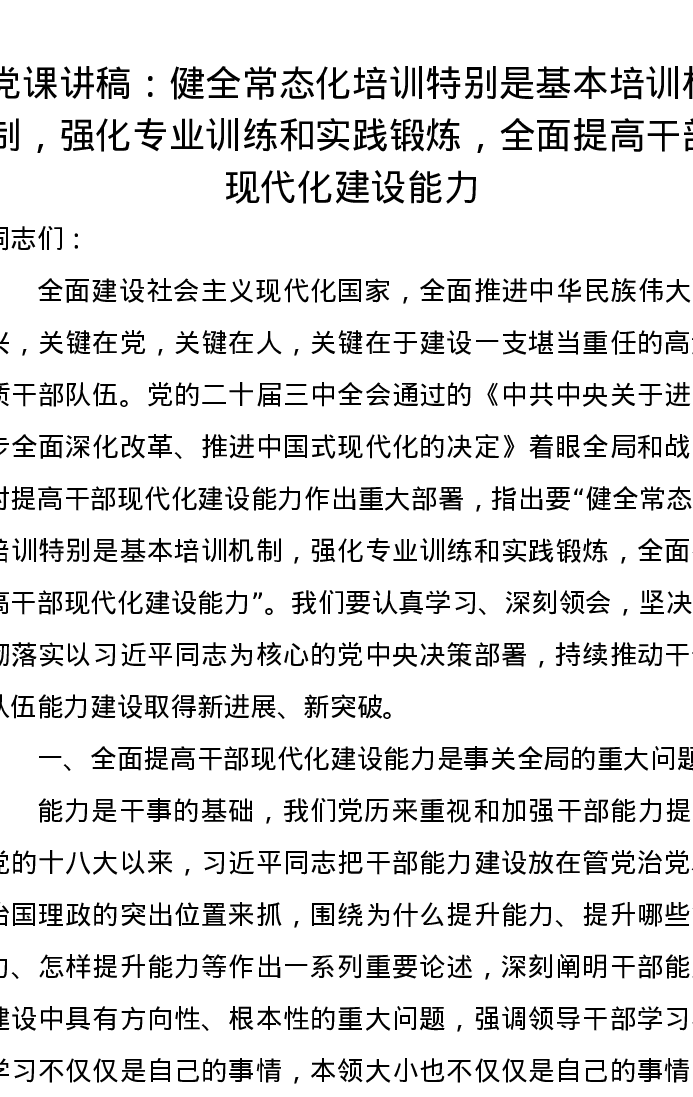 党课讲稿:健全常态化培训特别是基本培训机制,强化专业训练和实践锻炼,全面提高干部现代化建设能力