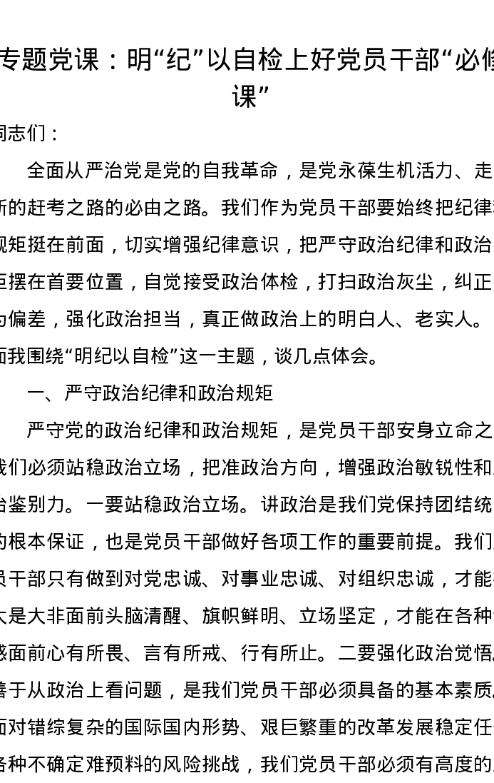 党课讲稿:明“纪”以自检上好党员干部“必修课”