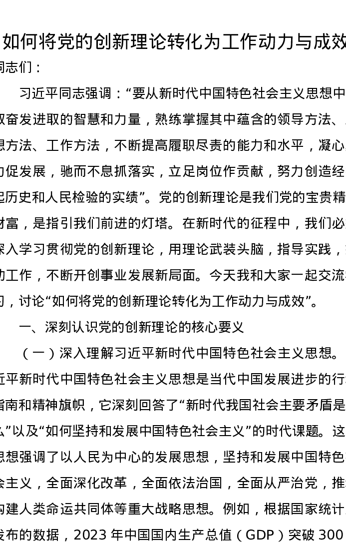 党课讲稿:如何将党的创新理论转化为工作动力与成效
