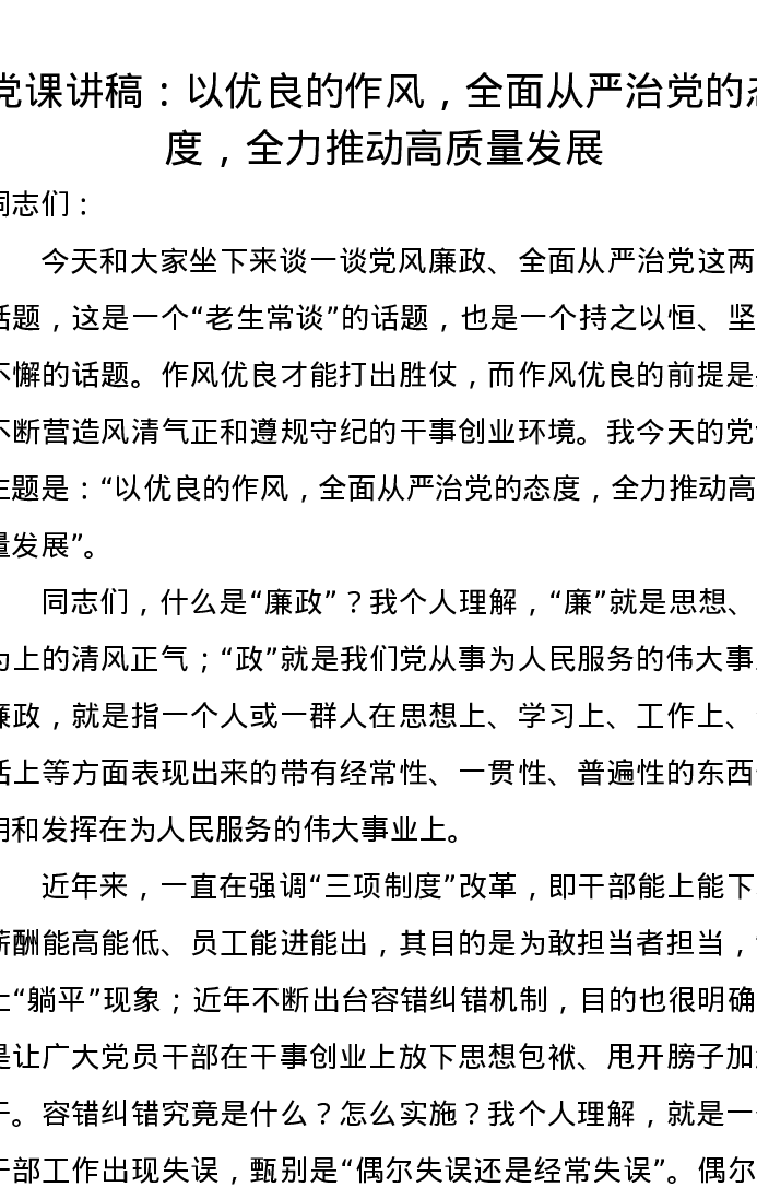 党课讲稿:以优良的作风,全面从严治党的态度,全力推动高质量发展