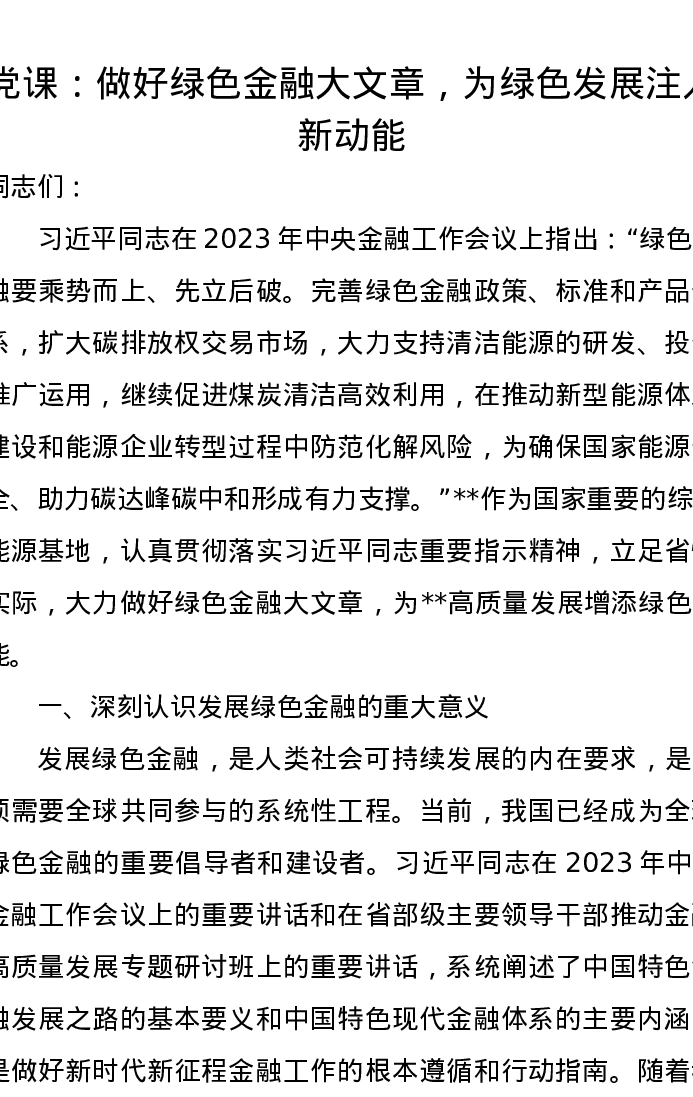 党课讲稿:做好绿色金融大文章,为绿色发展注入新动能