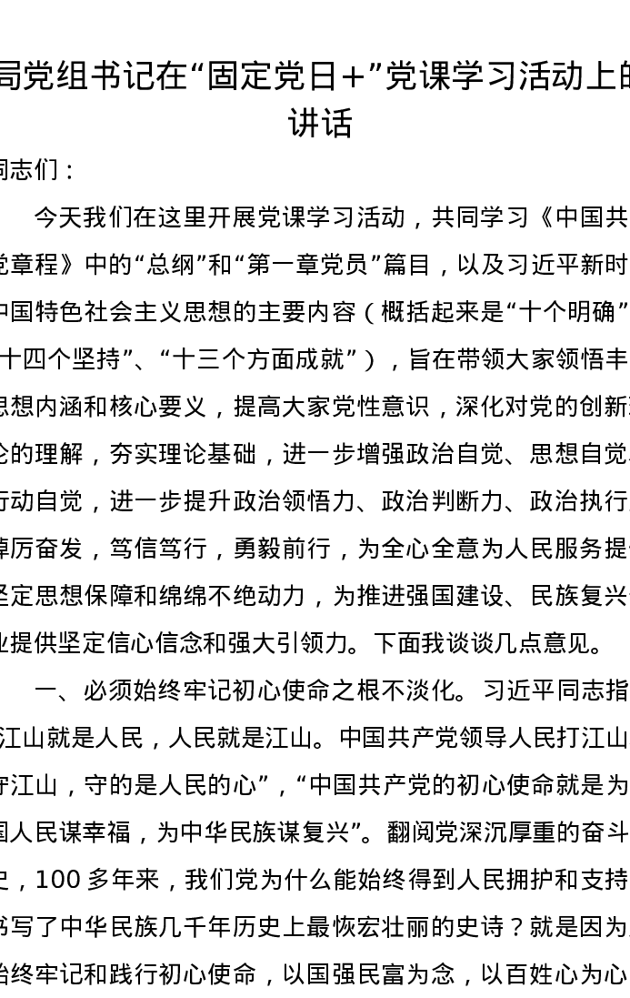 局党组书记在“固定党日+”党课学习活动上的讲话