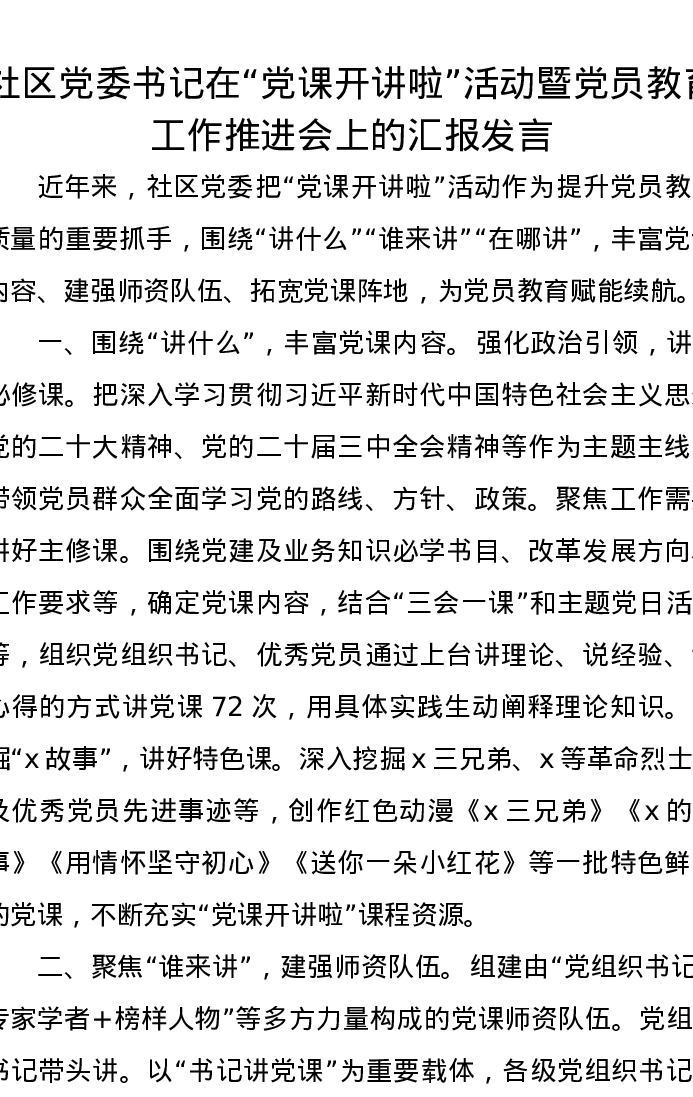社区党委书记在“党课开讲啦”活动暨党员教育工作推进会上的汇报发言