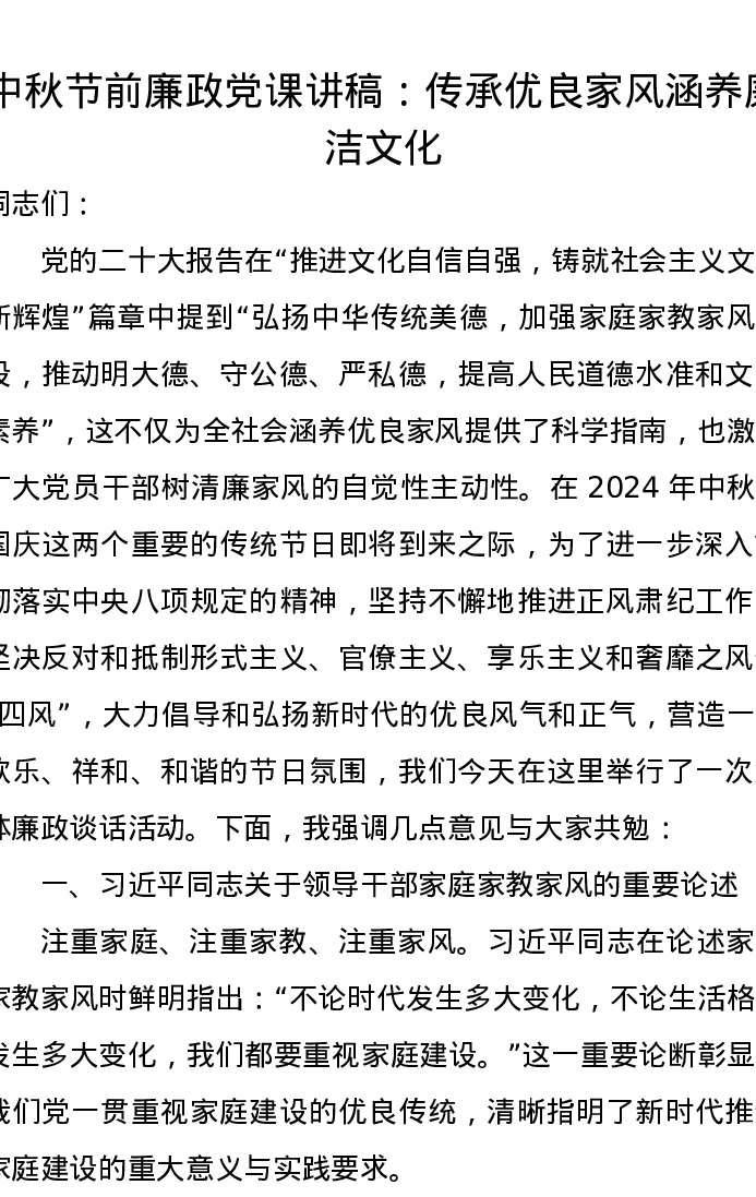 中秋节前廉政党课讲稿:传承优良家风涵养廉洁文化