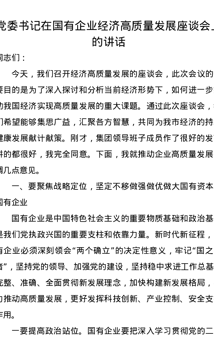党委书记在国有企业经济高质量发展座谈会上的讲话