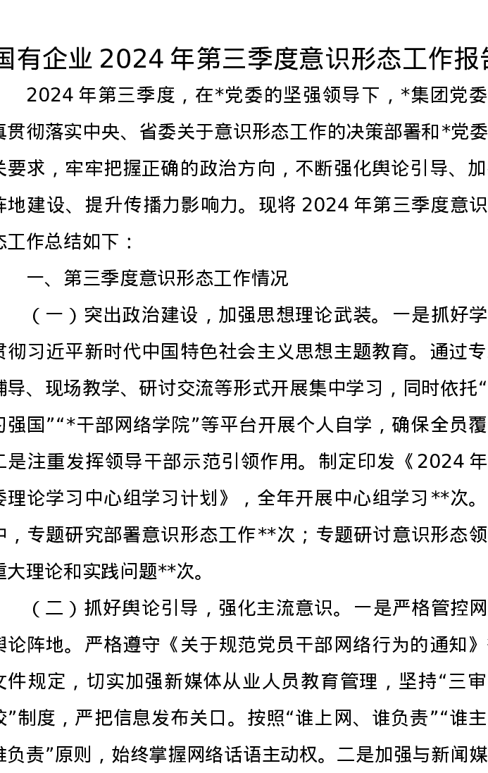 国有企业2024年第三季度意识形态工作报告
