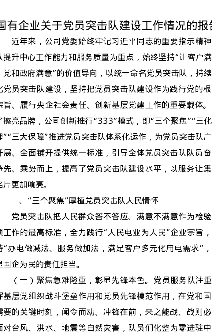 国有企业关于党员突击队建设工作情况的报告