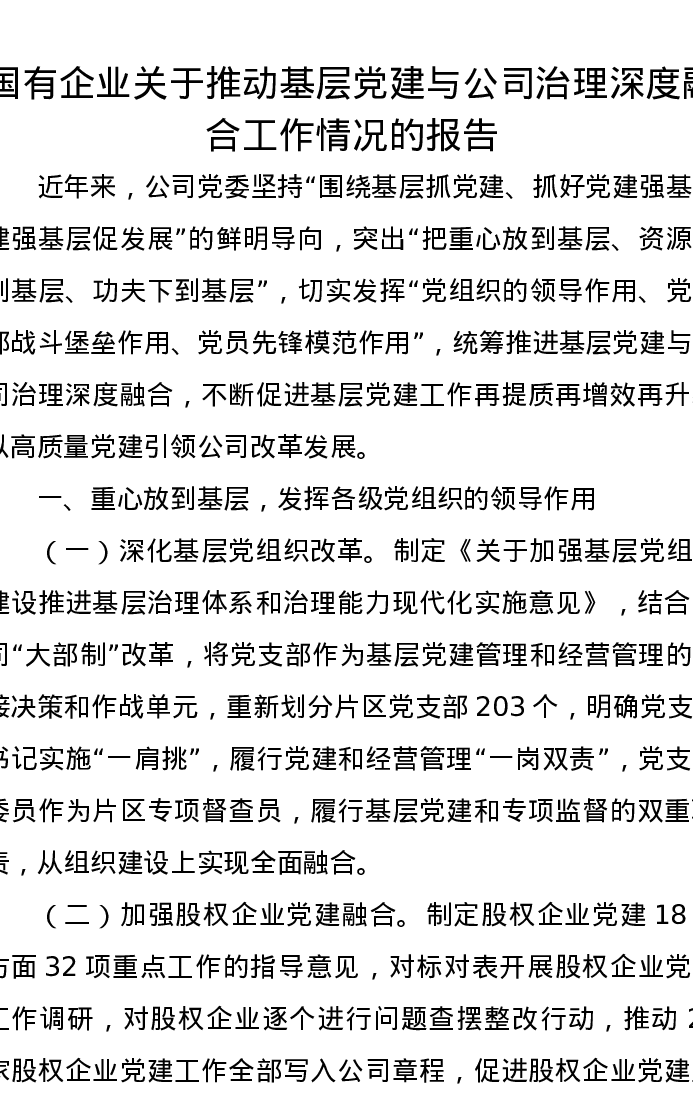 国有企业关于推动基层党建与公司治理深度融合工作情况的报告