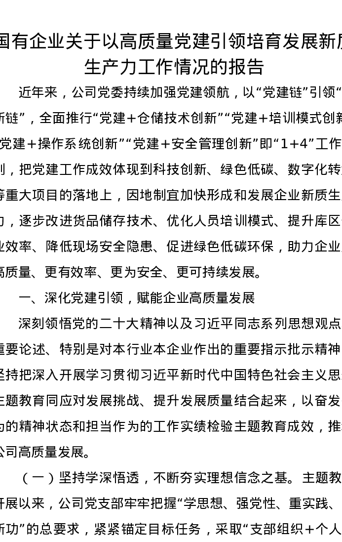 国有企业关于以高质量党建引领培育发展新质生产力工作情况的报告