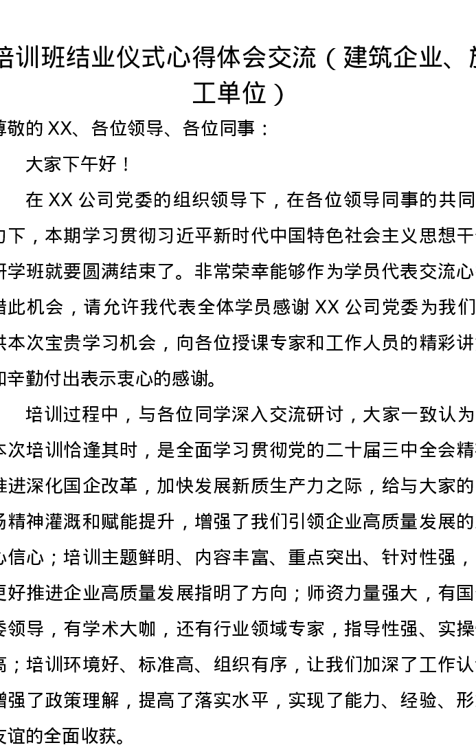 培训班结业仪式心得体会交流(建筑企业、施工单位)