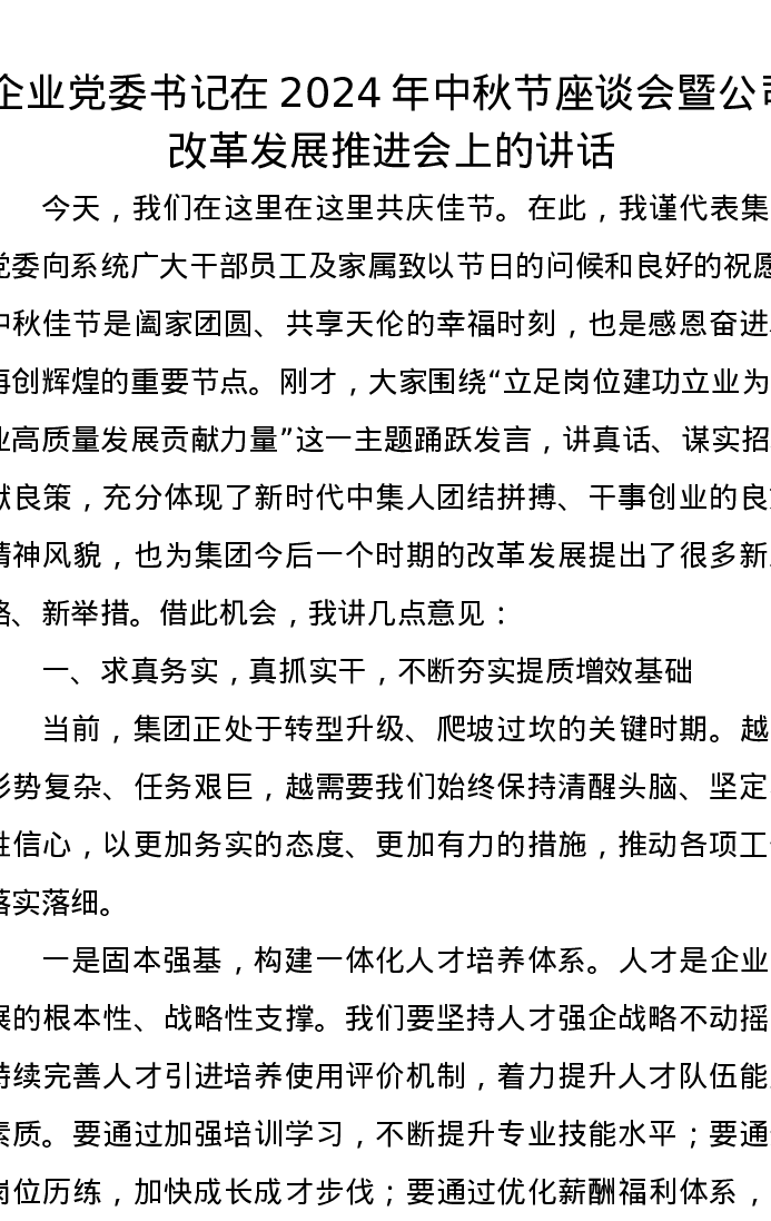 企业党委书记在2024年中秋节座谈会暨公司改革发展推进会上的讲话