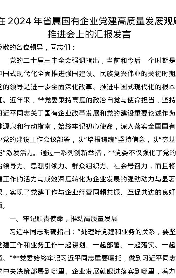 在2024年省属国有企业党建高质量发展观摩推进会上的汇报发言