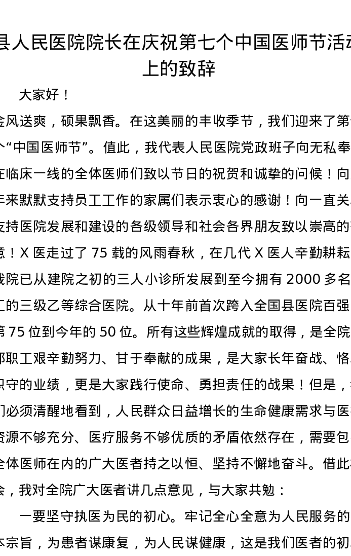 县人民医院院长在庆祝第七个中国医师节活动上的致辞