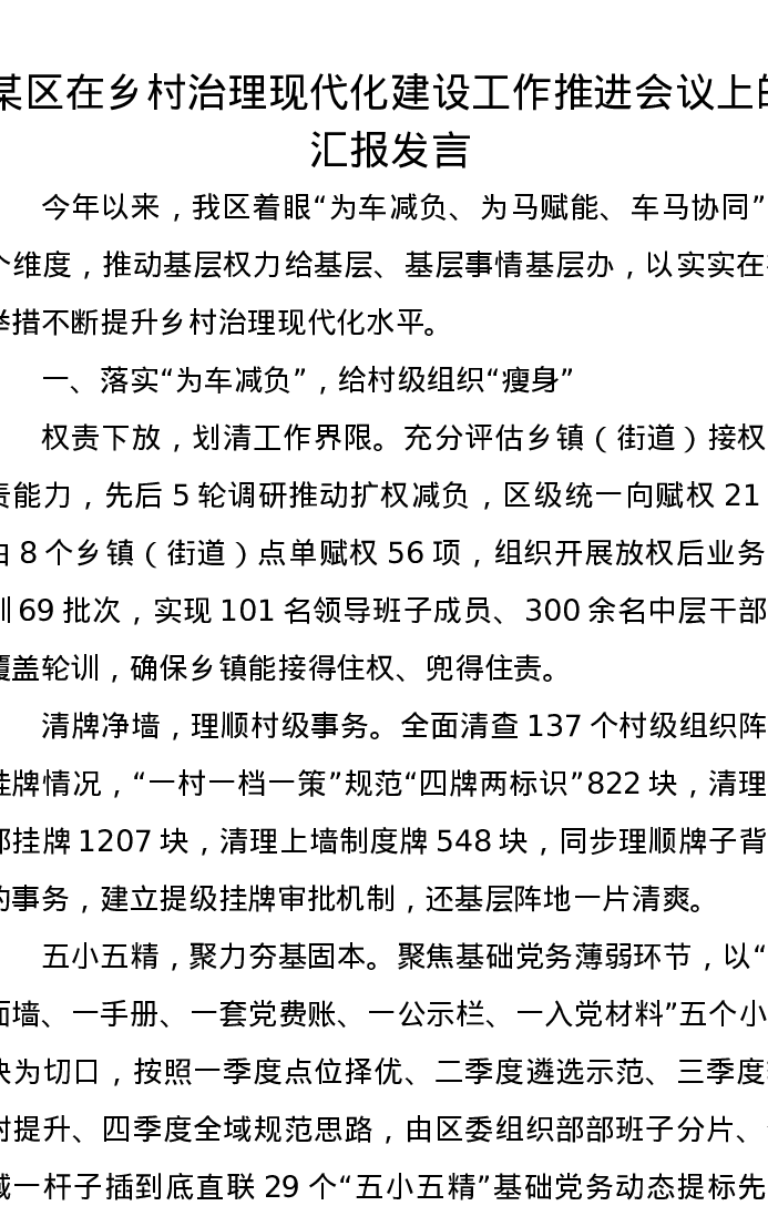 某区在乡村治理现代化建设工作推进会议上的汇报发言