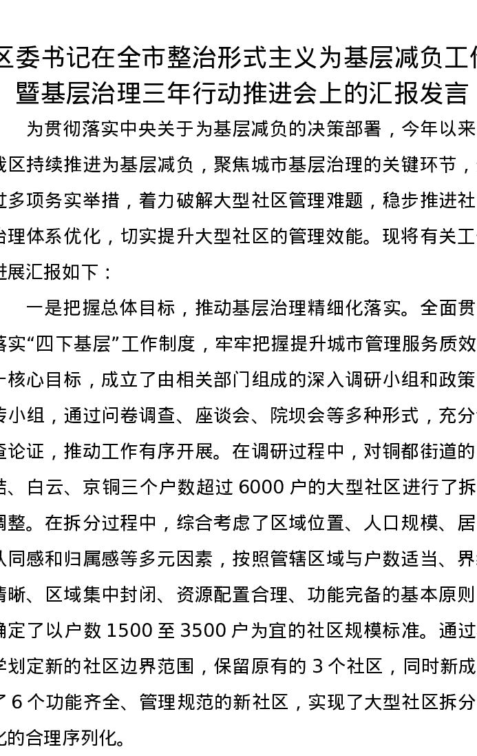 区委书记在全市整治形式主义为基层减负工作暨基层治理三年行动推进会上的汇报发言