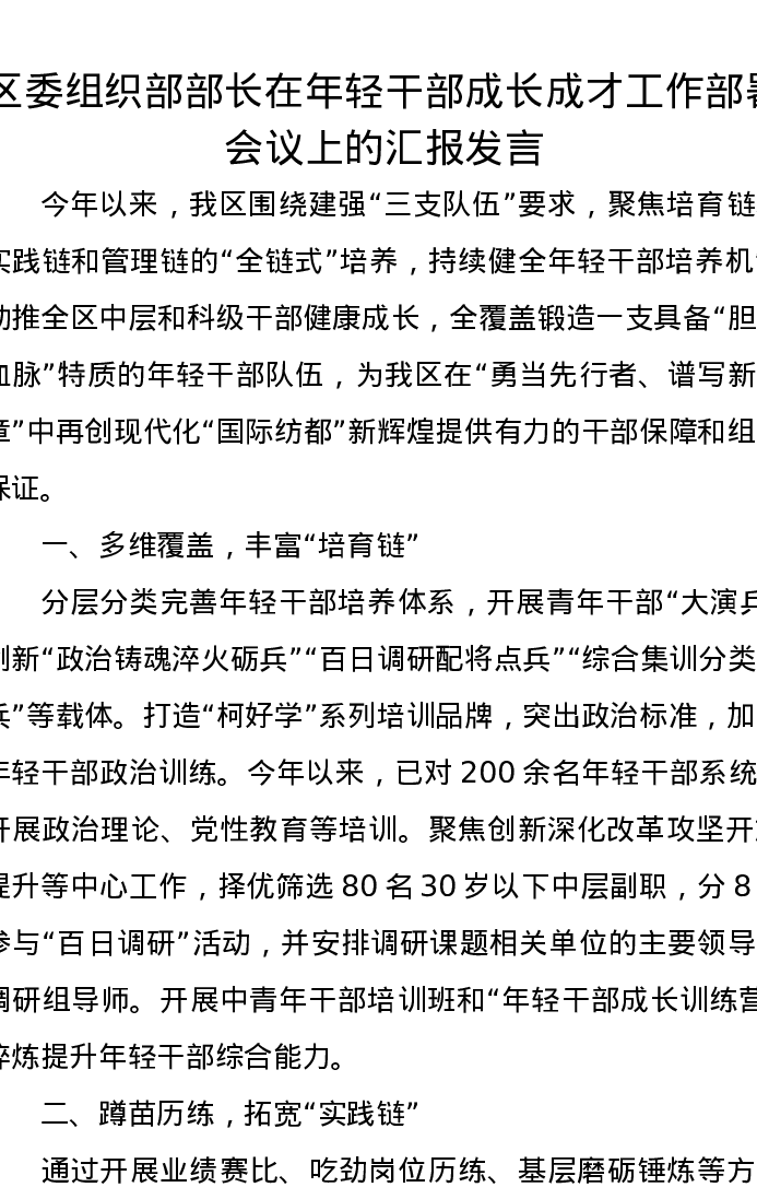 区委组织部部长在年轻干部成长成才工作部署会议上的汇报发言