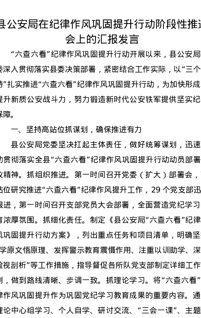 县公安局在纪律作风巩固提升行动阶段性推进会上的汇报发言