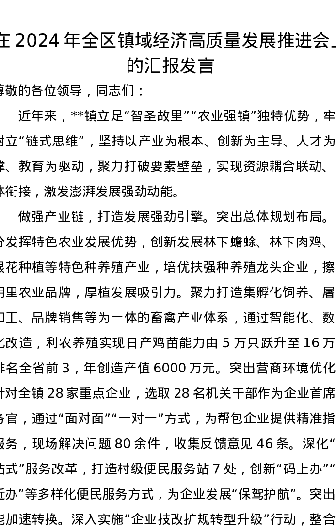在2024年全区镇域经济高质量发展推进会上的汇报发言