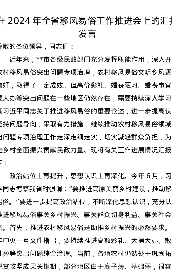 在2024年全省移风易俗工作推进会上的汇报发言