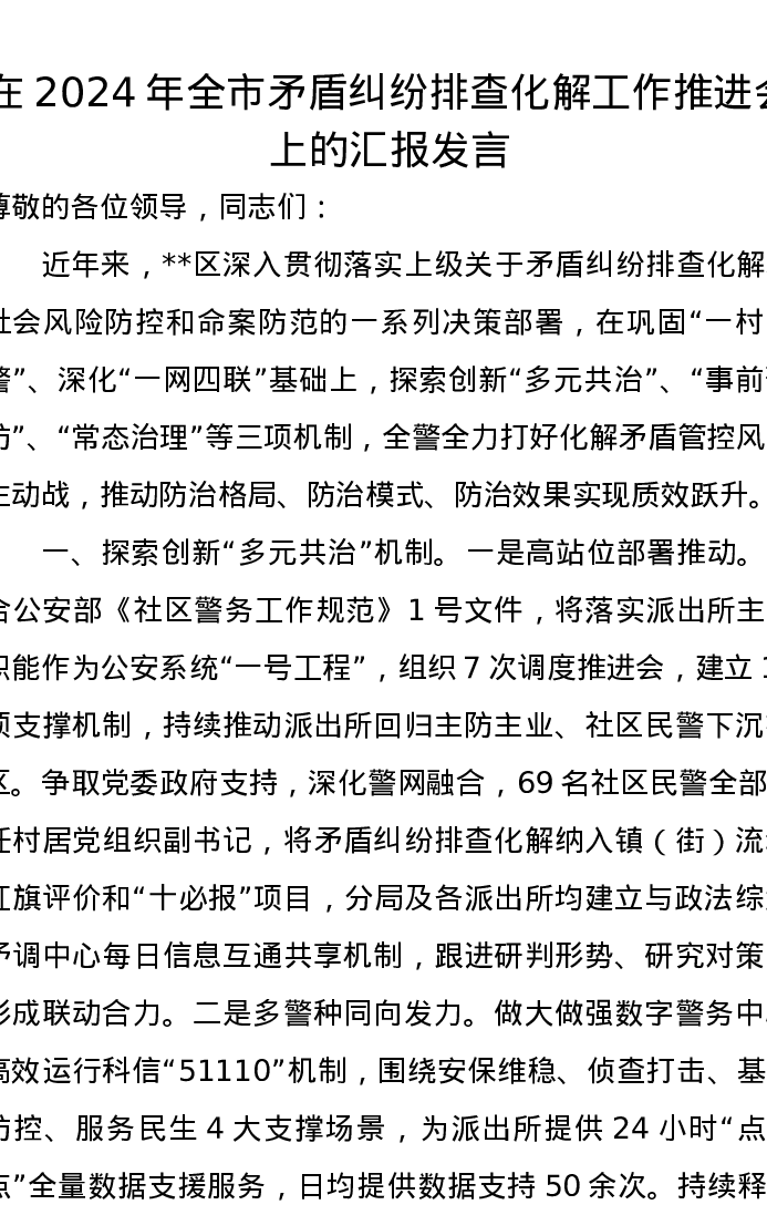 在2024年全市矛盾纠纷排查化解工作推进会上的汇报发言