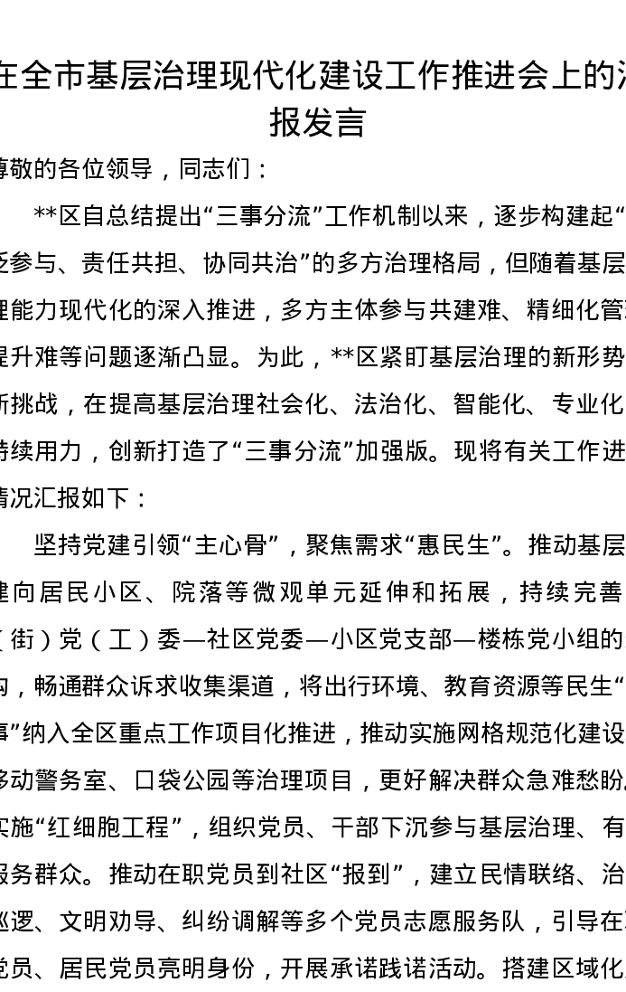 在全市基层治理现代化建设工作推进会上的汇报发言