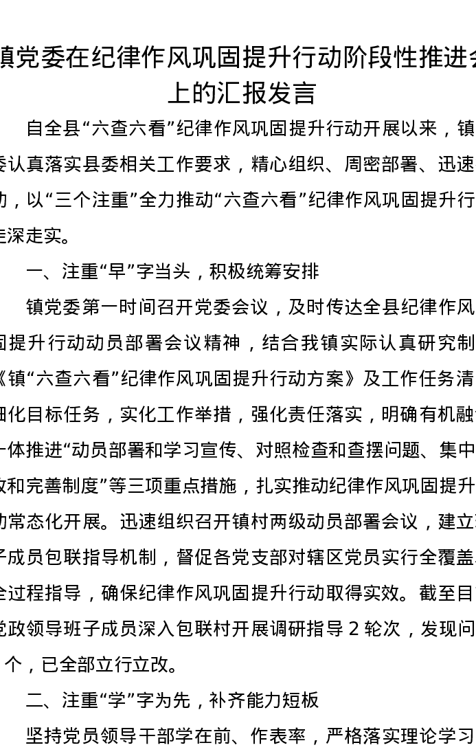 镇党委在纪律作风巩固提升行动阶段性推进会上的汇报发言