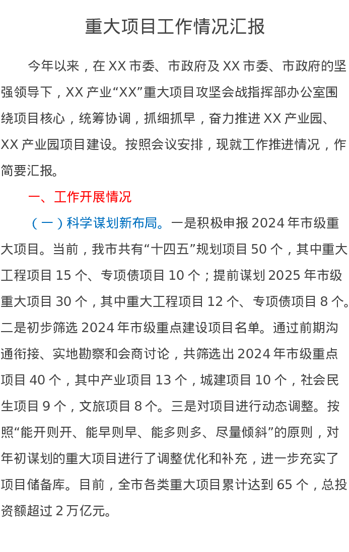 重大项目工作情况汇报