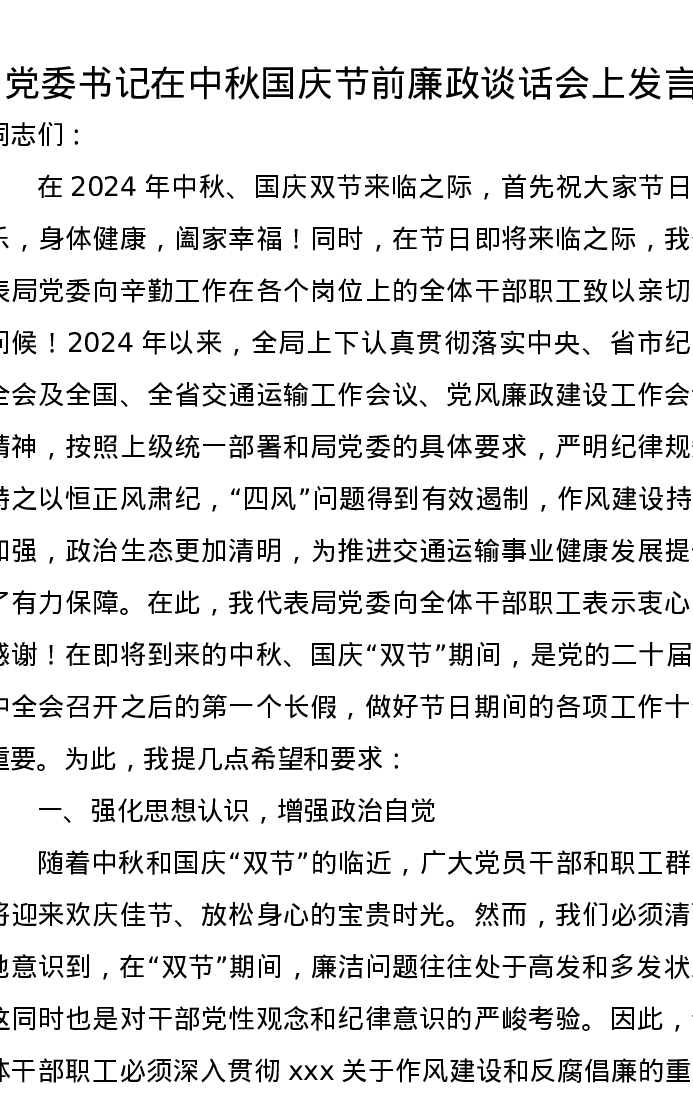 党委书记在中秋国庆节前廉政谈话会上发言