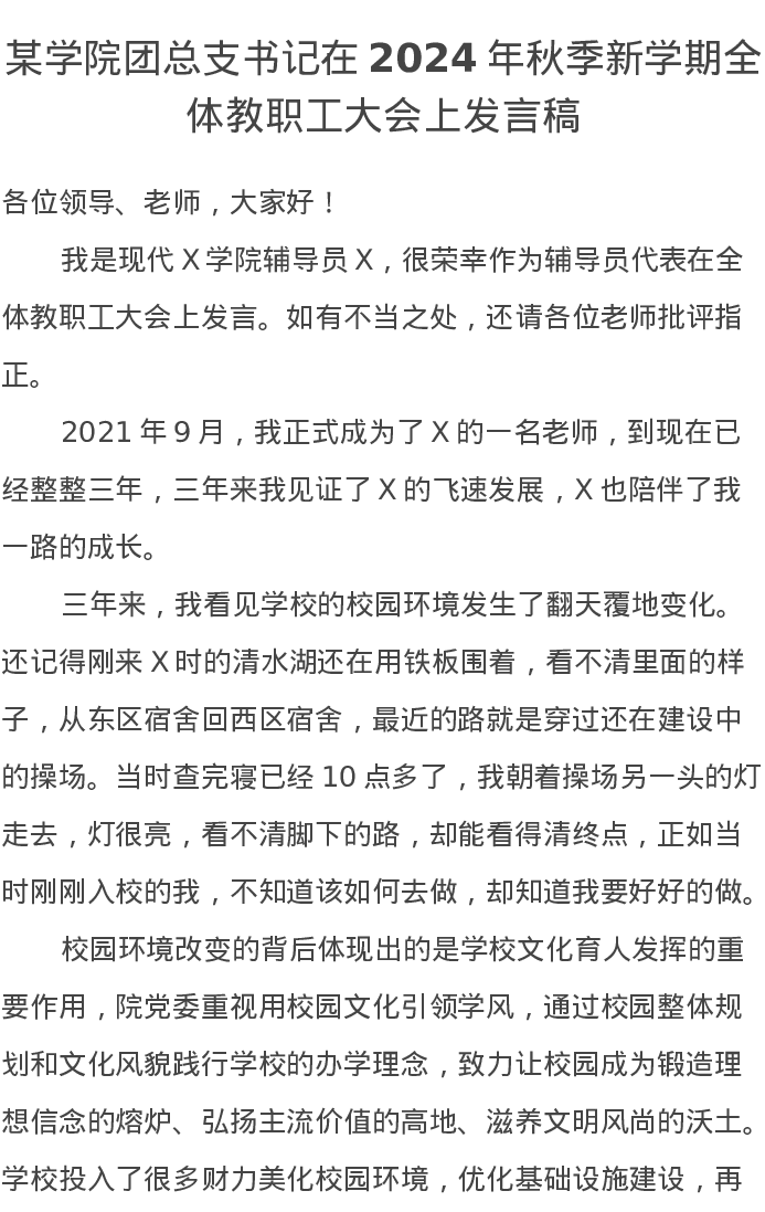 某学院团总支书记在2024年秋季新学期全体教职工大会上发言稿