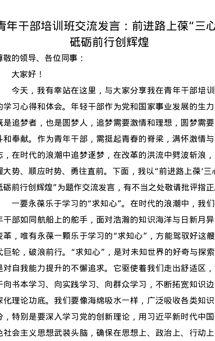 青年干部培训班交流发言:前进路上葆“三心”砥砺前行创辉煌
