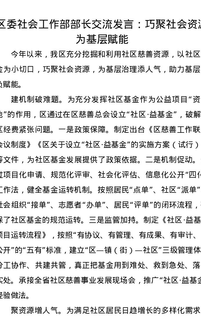 区委社会工作部部长交流发言:巧聚社会资源为基层赋能