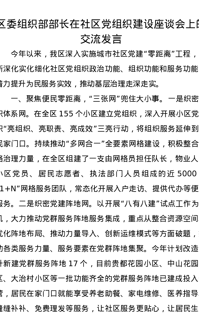 区委组织部部长在社区党组织建设座谈会上的交流发言