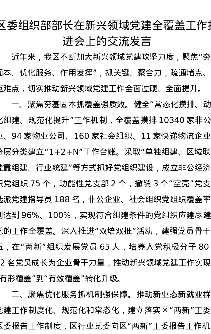 区委组织部部长在新兴领域党建全覆盖工作推进会上的交流发言