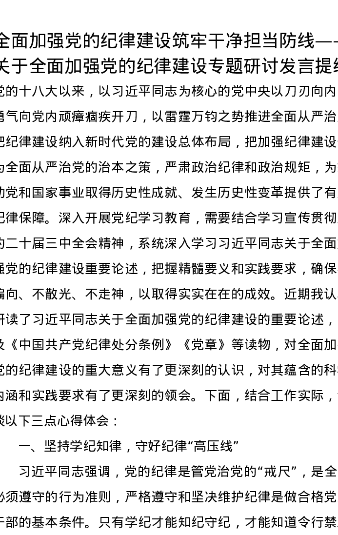 全面加强党的纪律建设筑牢干净担当防线——关于全面加强党的纪律建设专题研讨发言提纲