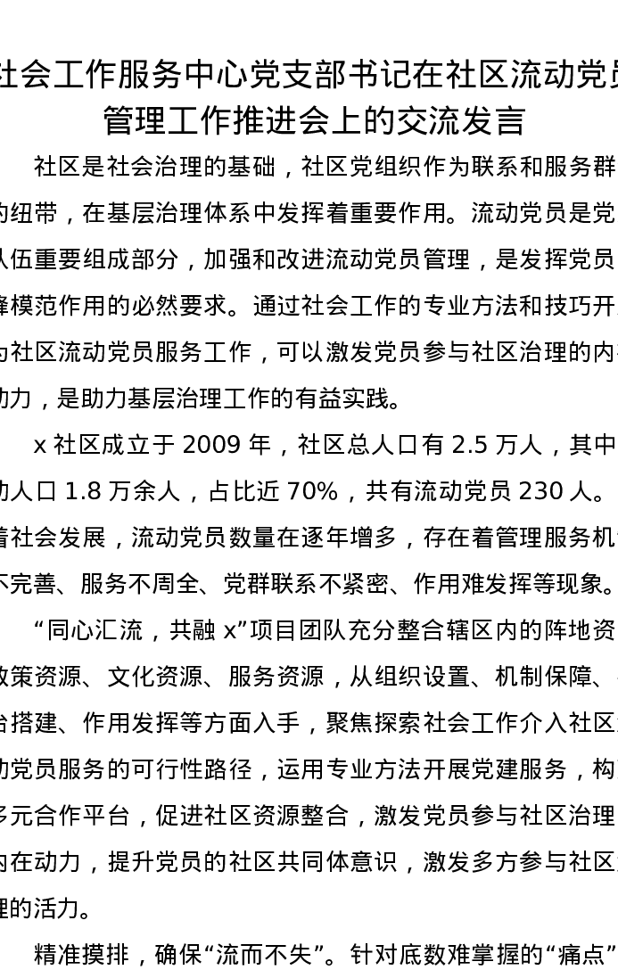 社会工作服务中心党支部书记在社区流动党员管理工作推进会上的交流发言