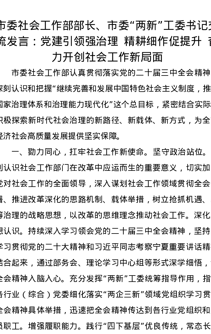 市委社会工作部部长、市委“两新”工委书记交流发言:党建引领强治理精耕细作促提升奋力开创社会工作新局面