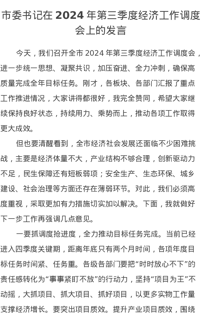 市委书记在2024年第三季度经济工作调度会上的发言