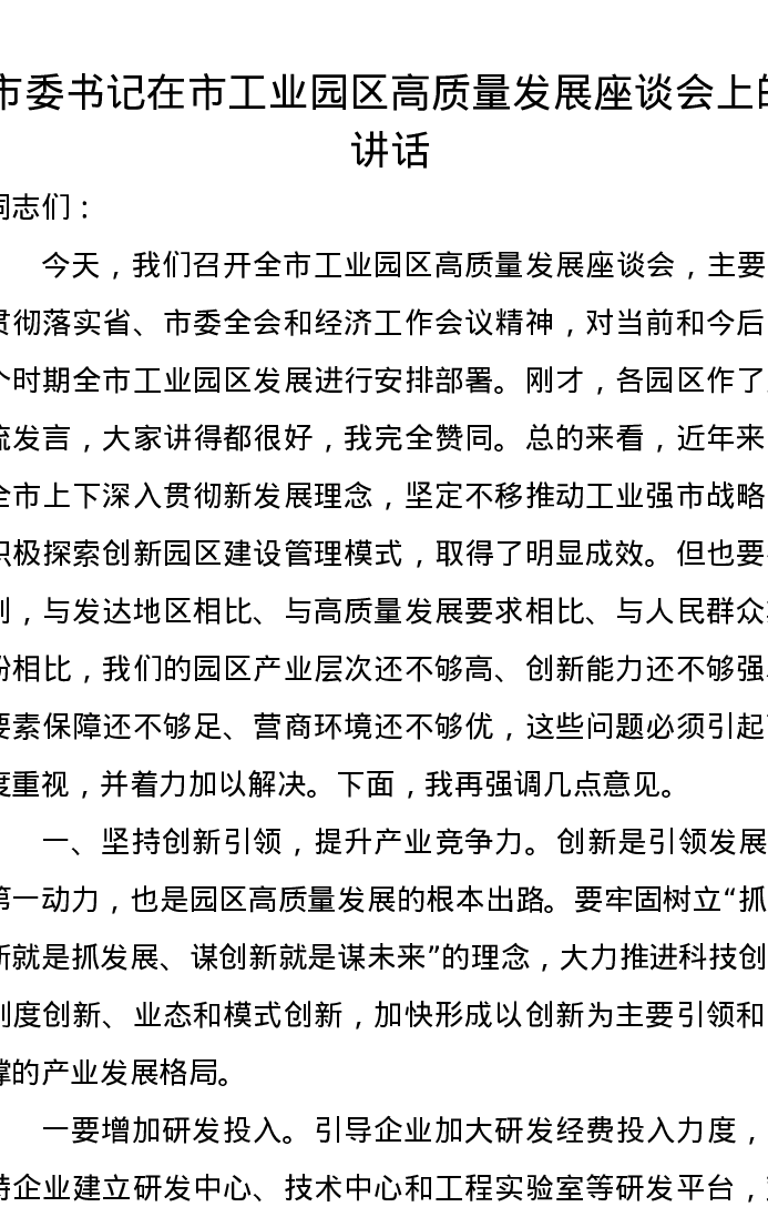 市委书记在市工业园区高质量发展座谈会上的讲话