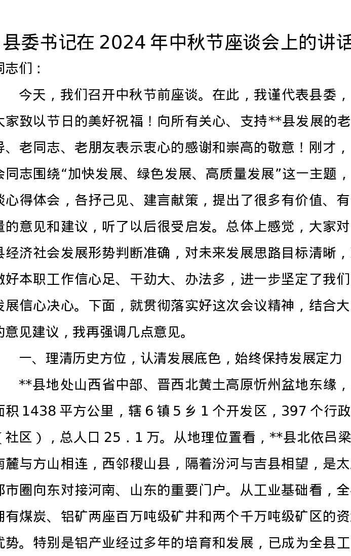 县委书记在2024年中秋节座谈会上的讲话