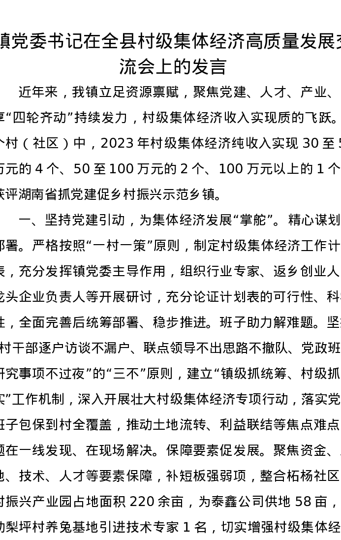 镇党委书记在全县村级集体经济高质量发展交流会上的发言