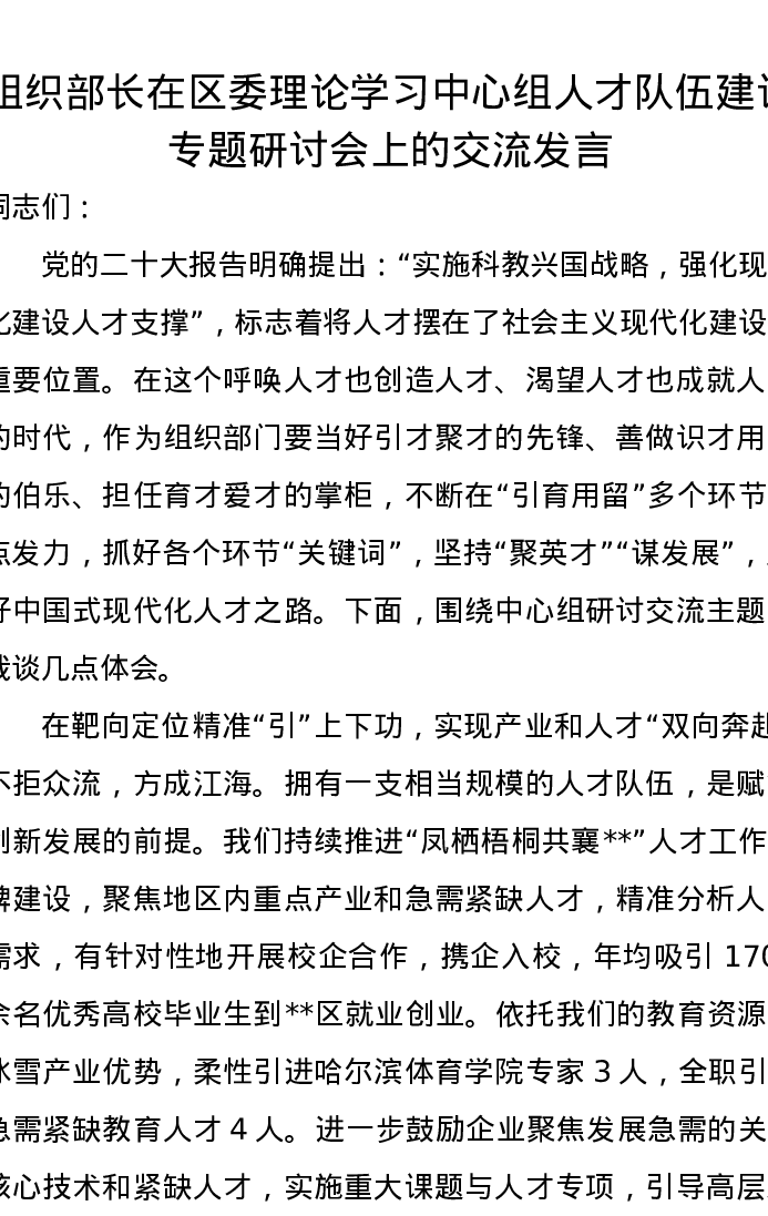 组织部长在区委理论学习中心组人才队伍建设专题研讨会上的交流发言