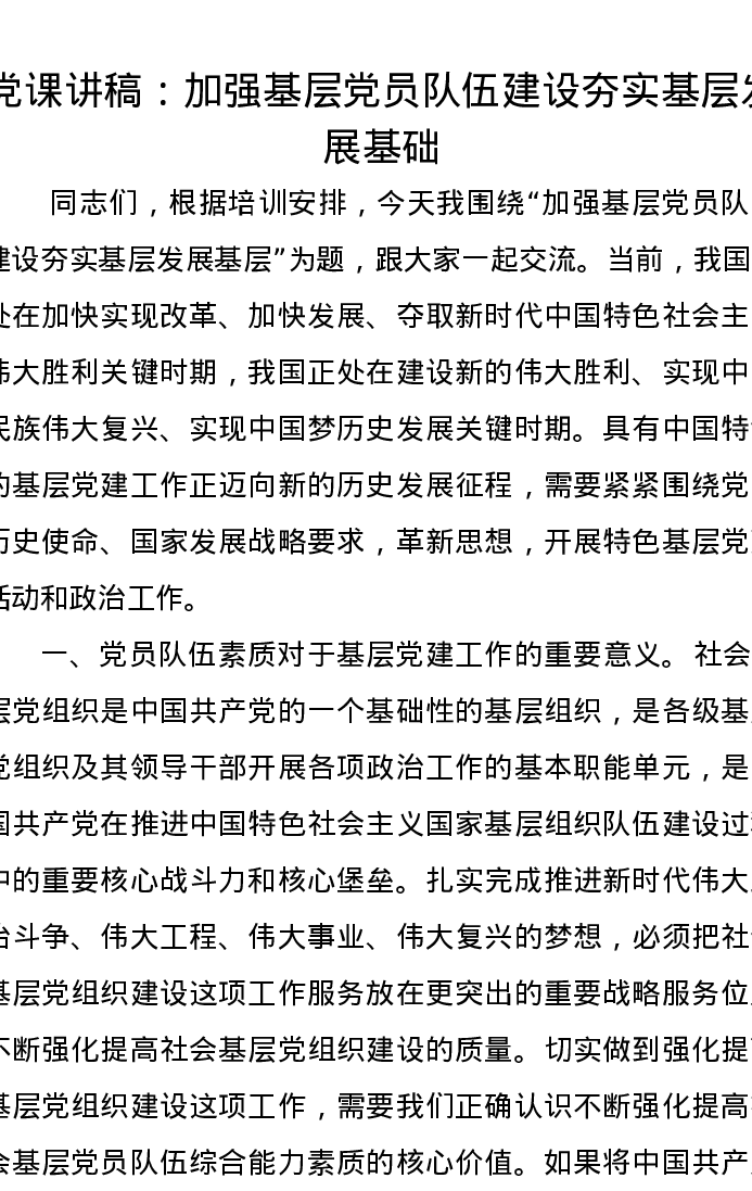 党课讲稿:加强基层党员队伍建设夯实基层发展基础