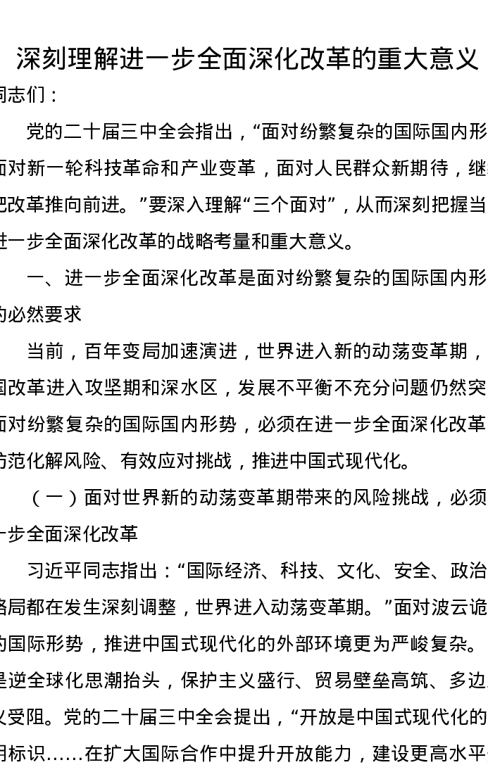 党课讲稿:深刻理解进一步全面深化改革的重大意义