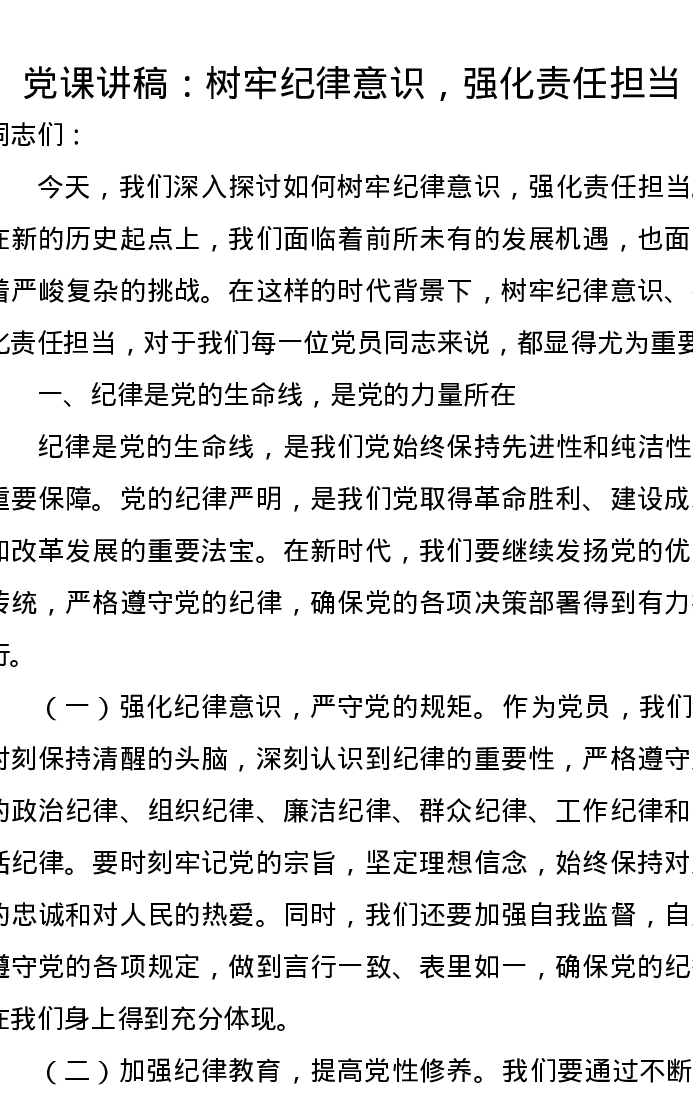 党课讲稿:树牢纪律意识,强化责任担当