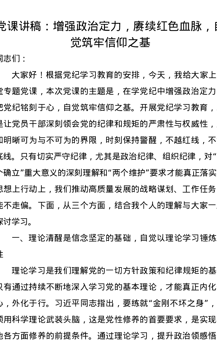 党课讲稿:增强政治定力,赓续红色血脉,自觉筑牢信仰之基