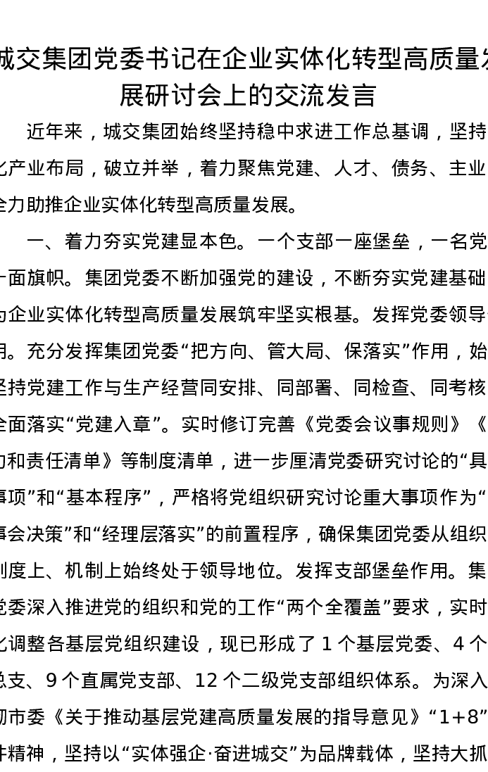 城交集团党委书记在企业实体化转型高质量发展研讨会上的交流发言